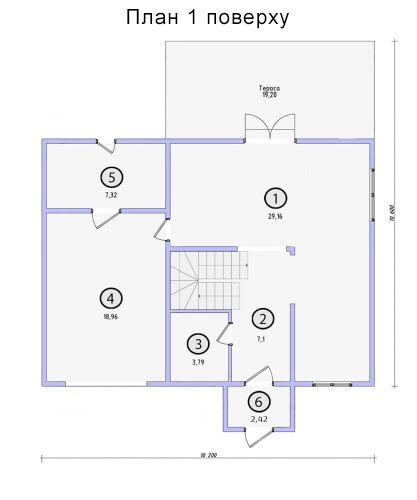 До вхідних дверей веде зовнішній ганок, внутрішній проходить у виступаючій частині будівлі. Короткий коридор відкривається у простору, рясно освітлену вітальню-їдальню вигнутої форми, яка має виходи до сходів на другий поверх, у гараж та у двір. Ліворуч коридором знаходиться невеликий санвузол.