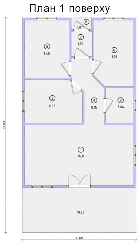 Будівництво каркасного будинку такого типу проводиться в стислі терміни, є доступним за бюджетом варіантом, надійним, практичним і сучасним житлом. Незважаючи на відносно малу житлову площу та наявність всього одного поверху, вільний простір використано максимально ефективно та зручно, для організації побуту.