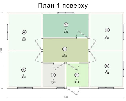 Будинок має один великий коридор, з якого можна потрапити у всі приміщення: кімнати, санвузол та кухню. Основних кімнат чотири, практично всі вони однакові за квадратурою. Ви можете самі вирішити, де буде кабінет, де спальня чи вітальня. Наявність чотирьох вільних приміщень дозволяє жити в такому будинку, як мінімум двом дорослим і двом дітям. Планування такого будинку дозволяє грамотно спланувати простір кожного куточка, і використовувати всі кімнати по максимуму.